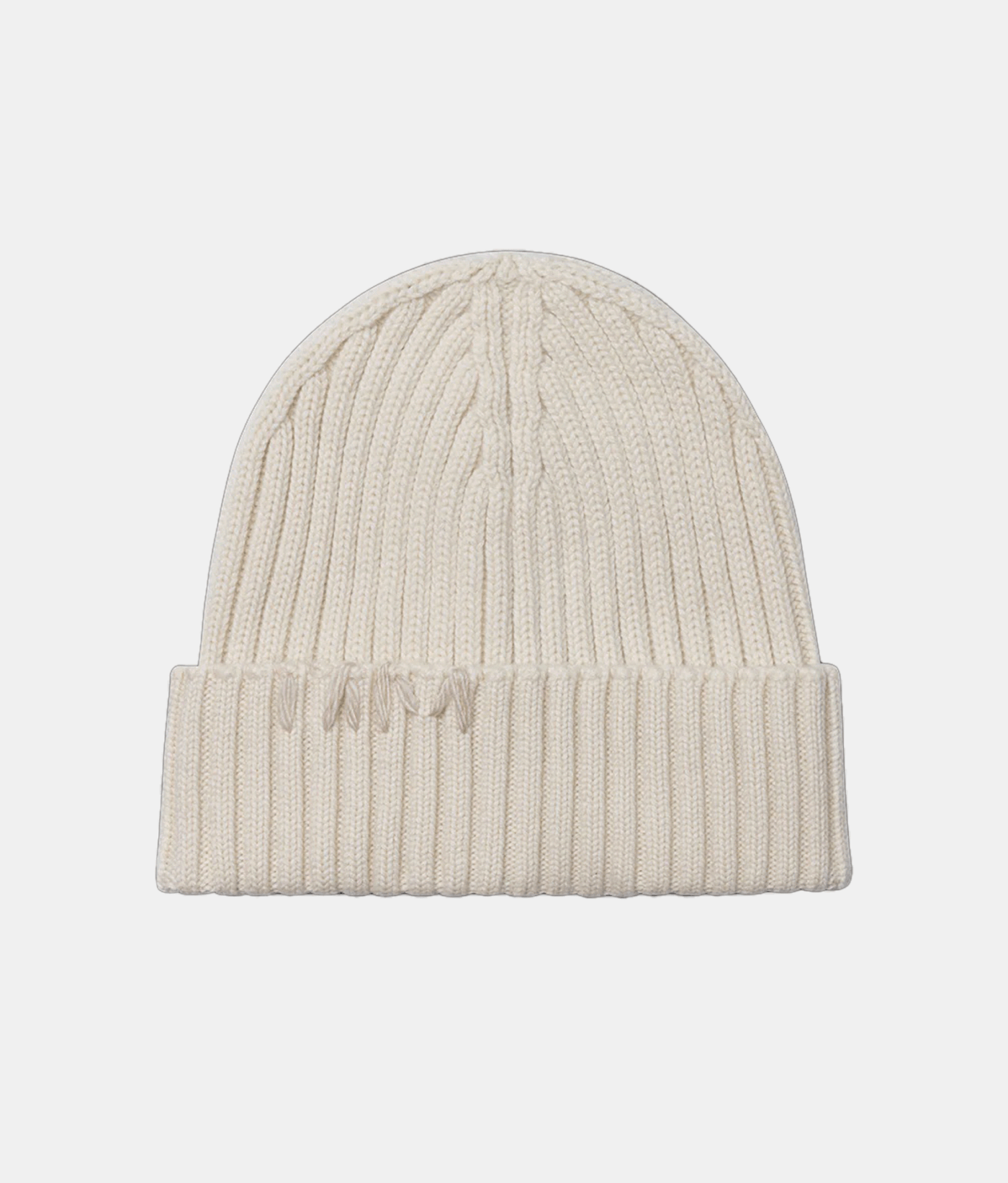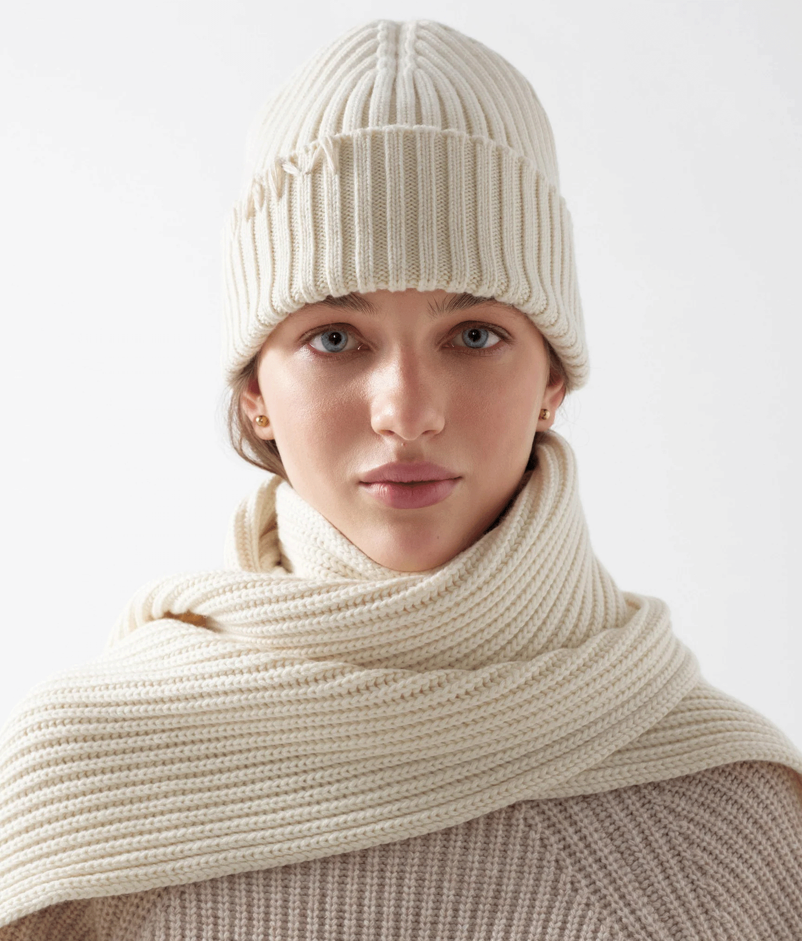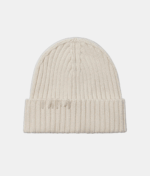 В’язана молочна шапка з ніжної вовни та кашеміру. Оздоблена декоративним стібком ручної роботи. Еластична та приємна до тіла та чудово поєднується з сірим шарфом у тон.