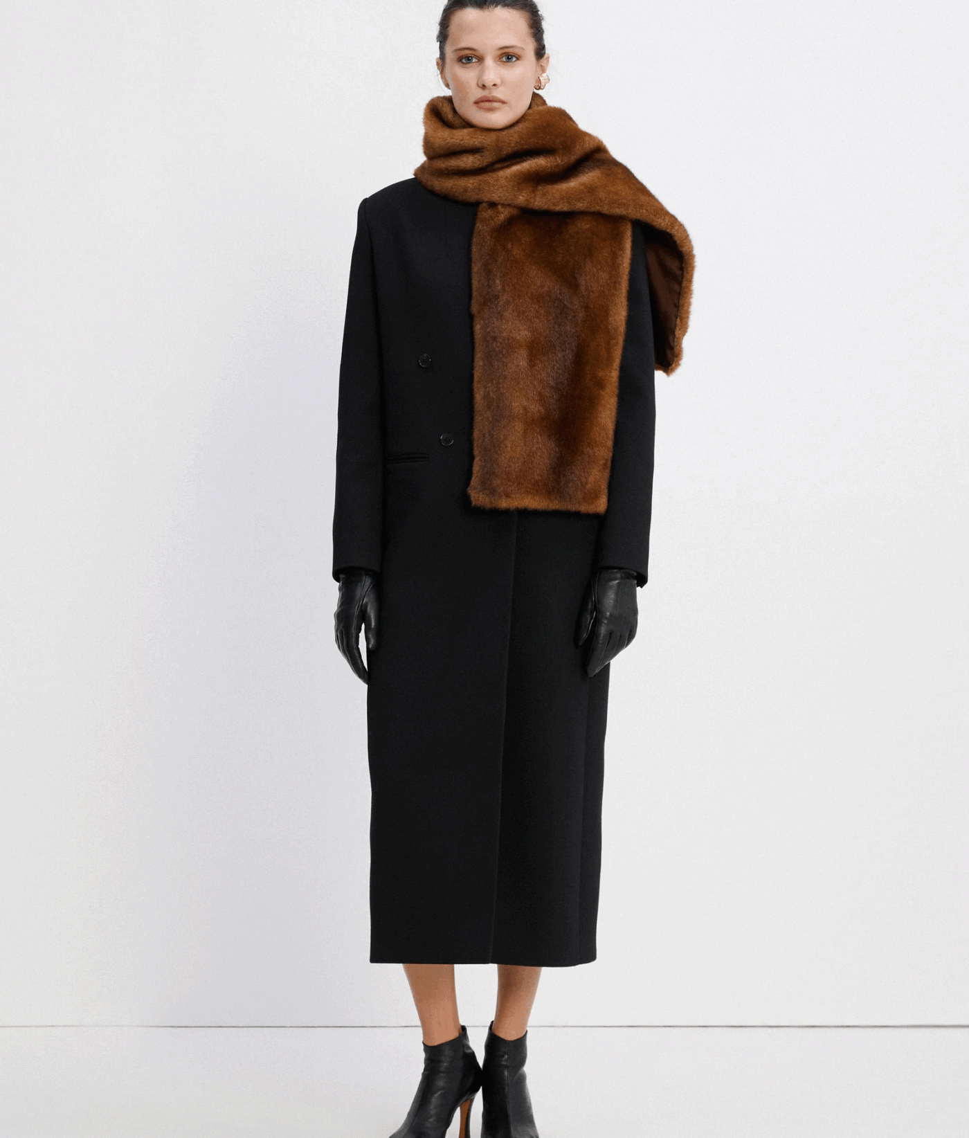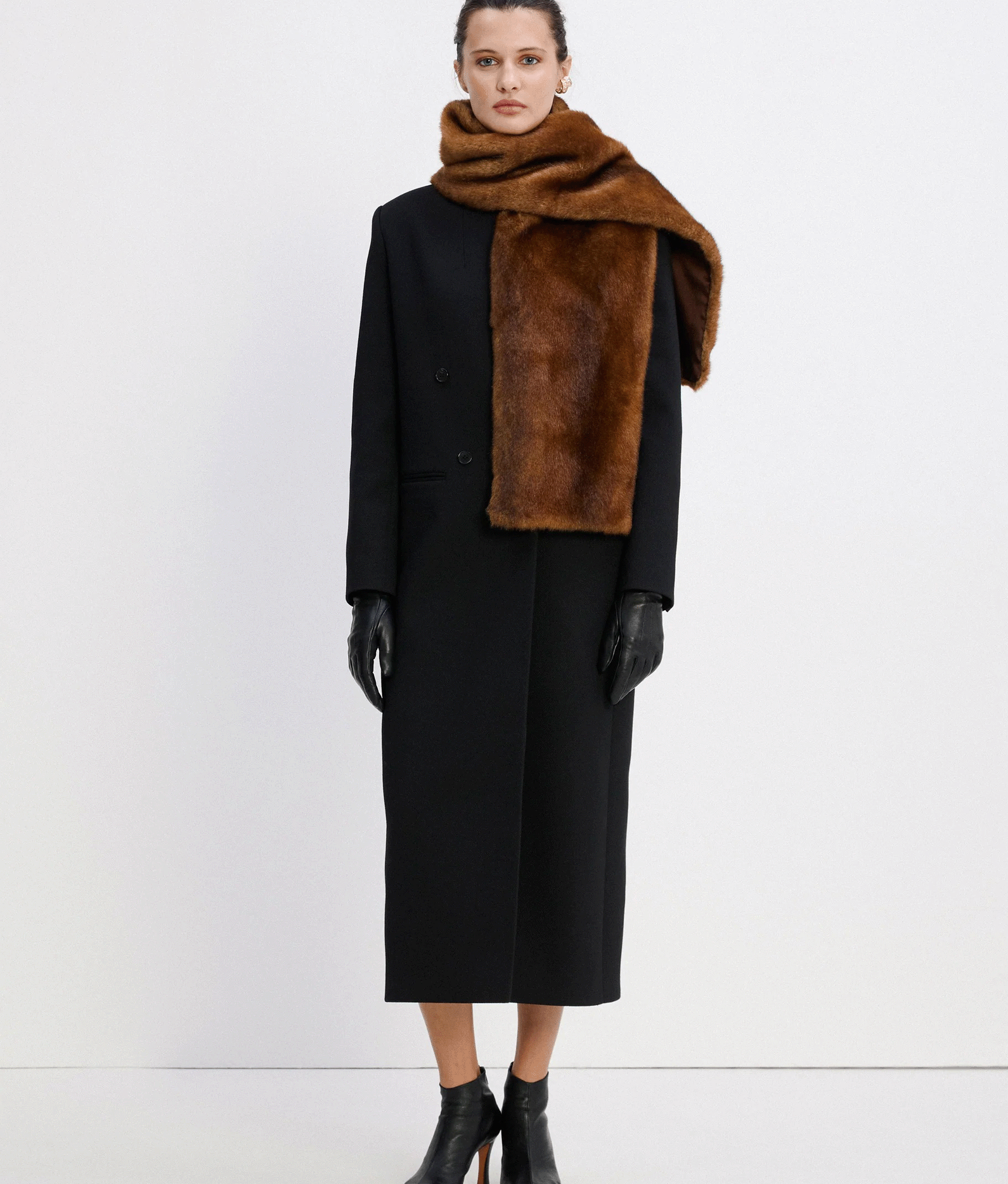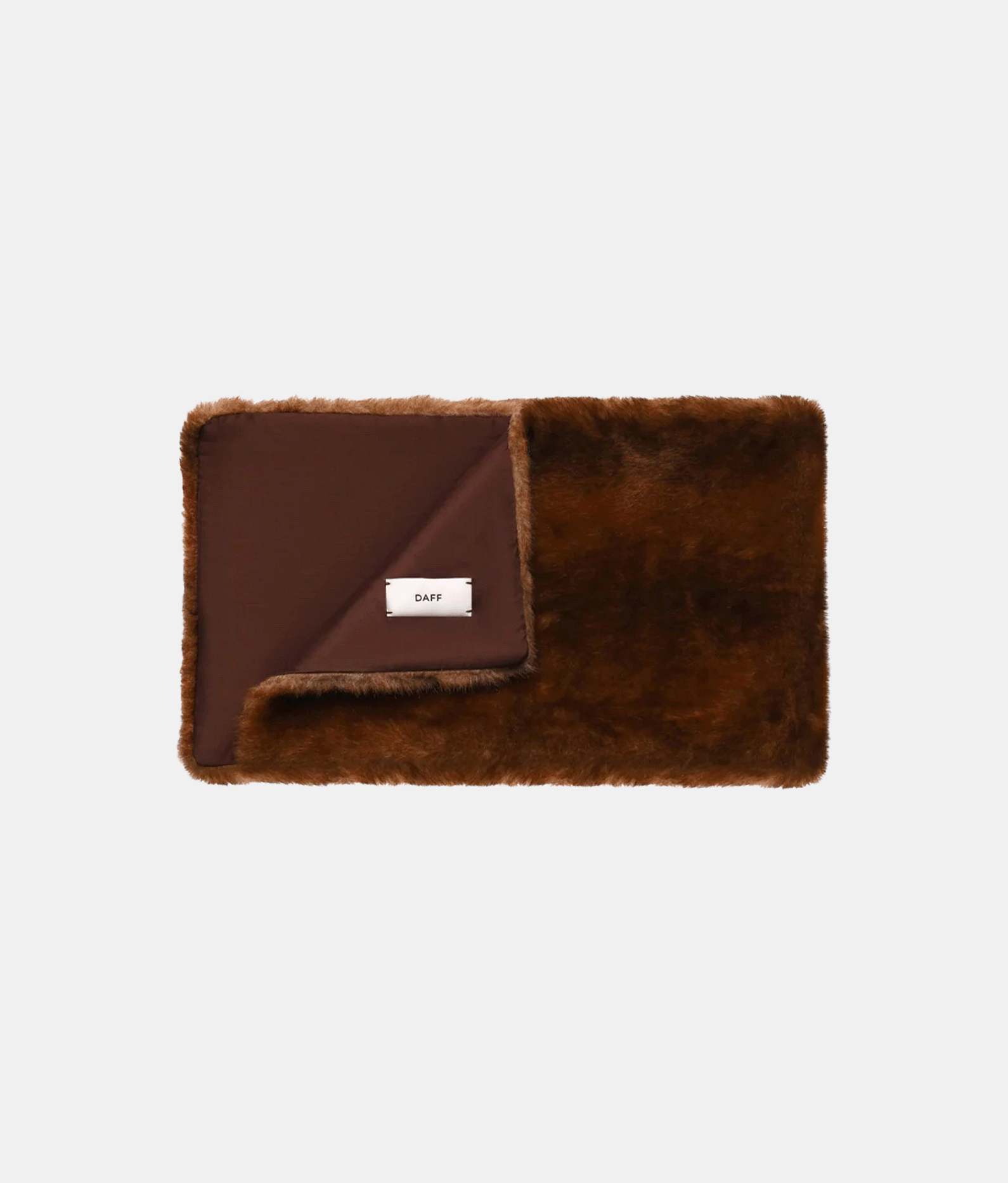 Шарф з м’якого штучного хутра насиченого коричневого кольору. Легка вискозна підкладка, прямий крій, універсальна довжина.