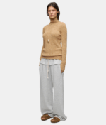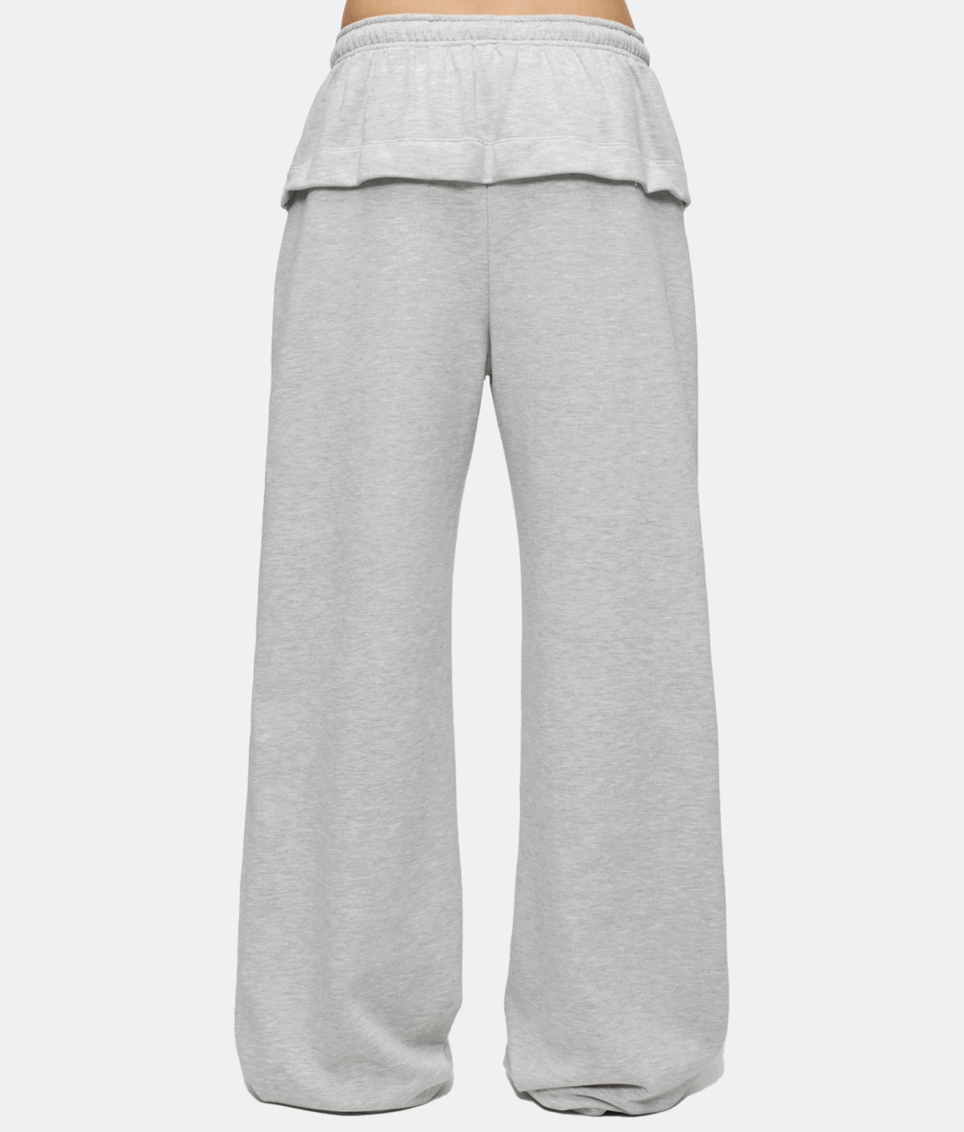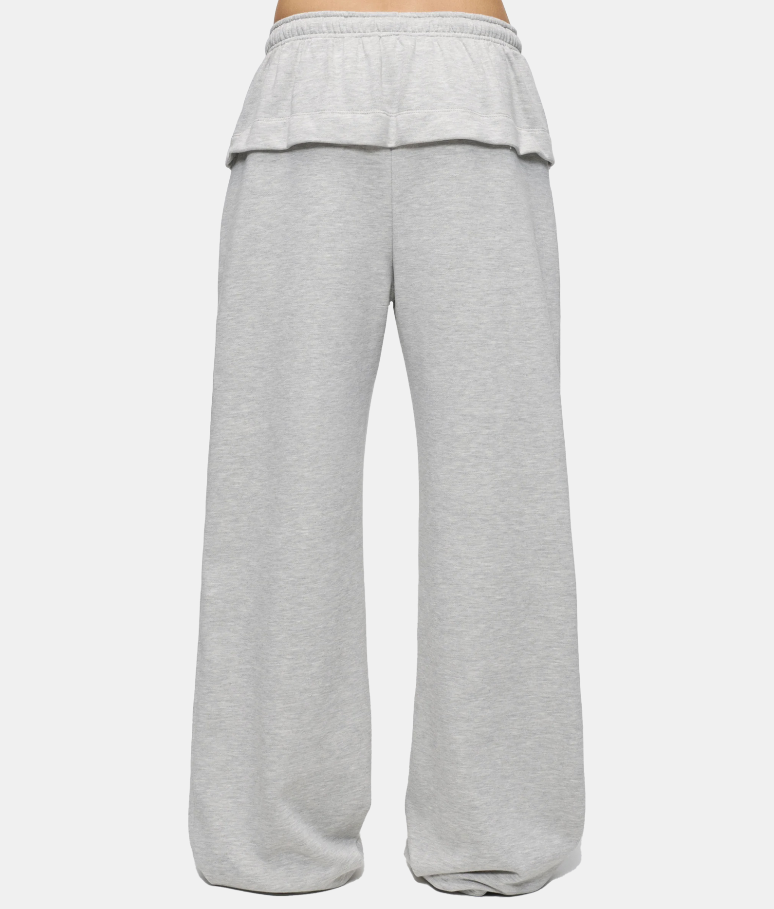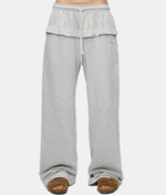 Комфортні штани вільного крою світло-сірого кольору з декоративним поясом-воланом. Пояс на резинці з молочним бавовняним шнурком, доповнені фірмовим логотипом. Затишна модель для повсякденного носіння та відпочинку.​​​​​​​​​​​​​​​​