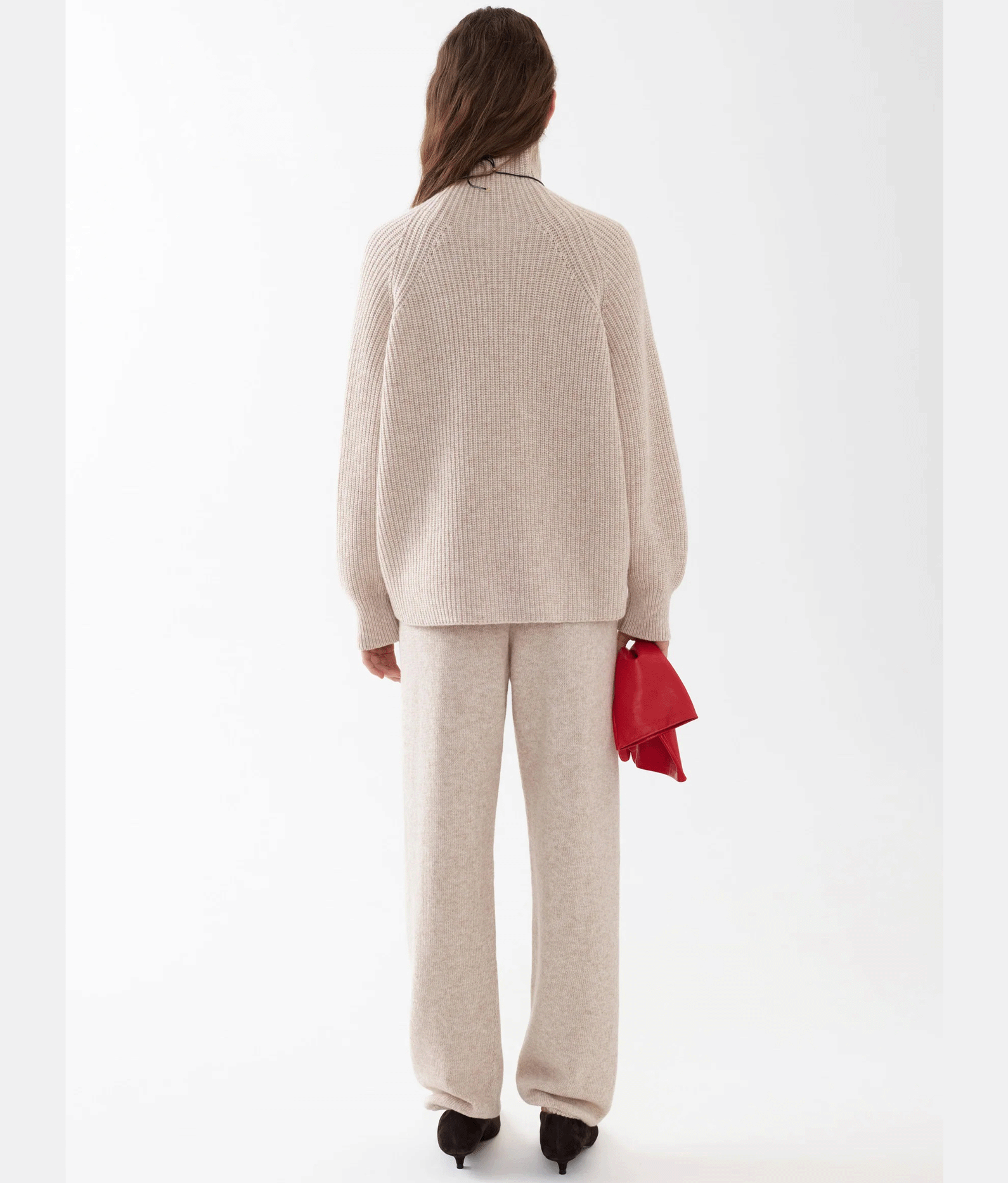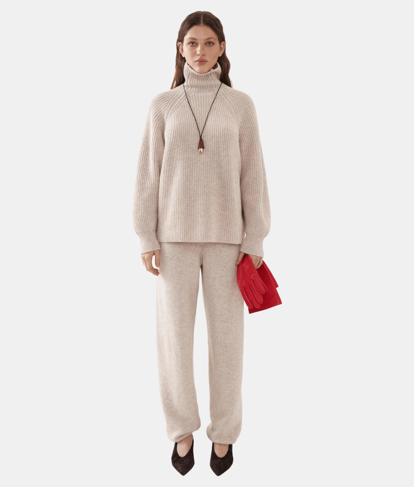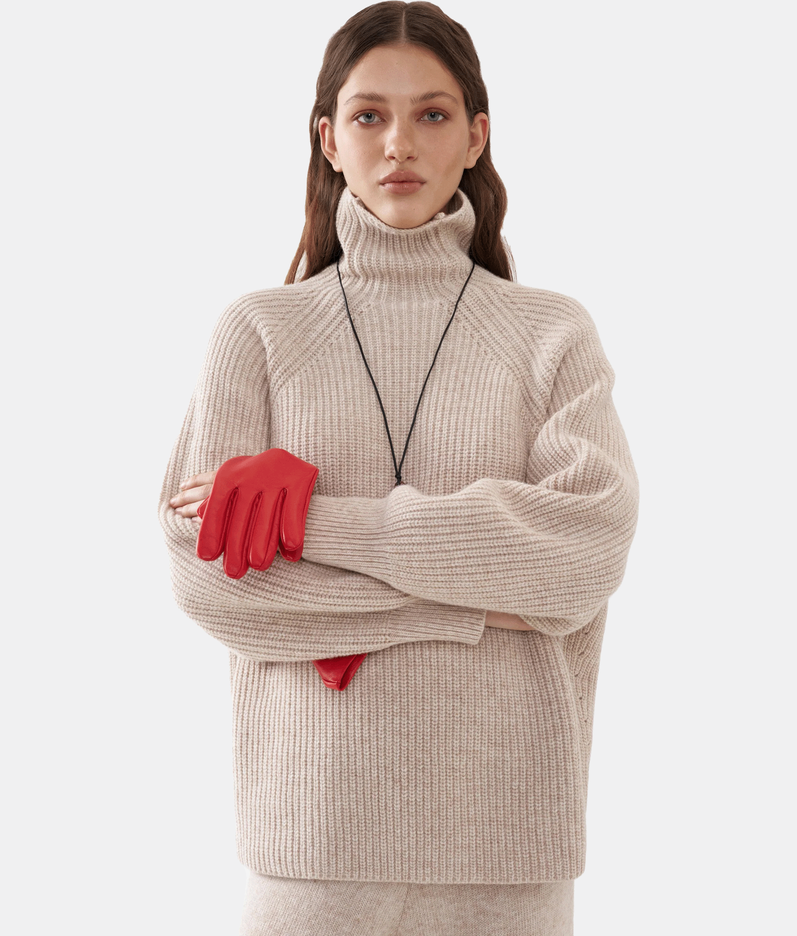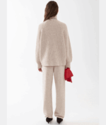 Теплий оверсайз светр грубої в’язки із високою горловиною, виконаний із мериносової вовни з додаванням кашеміру. Добре тримає тепло та форму, забезпечує комфорт під час носіння. Легко поєднується із штанами в тон, а також з верхнім одягом, шарфами, шапками та балаклавами, додаючи образу затишку й стилю.