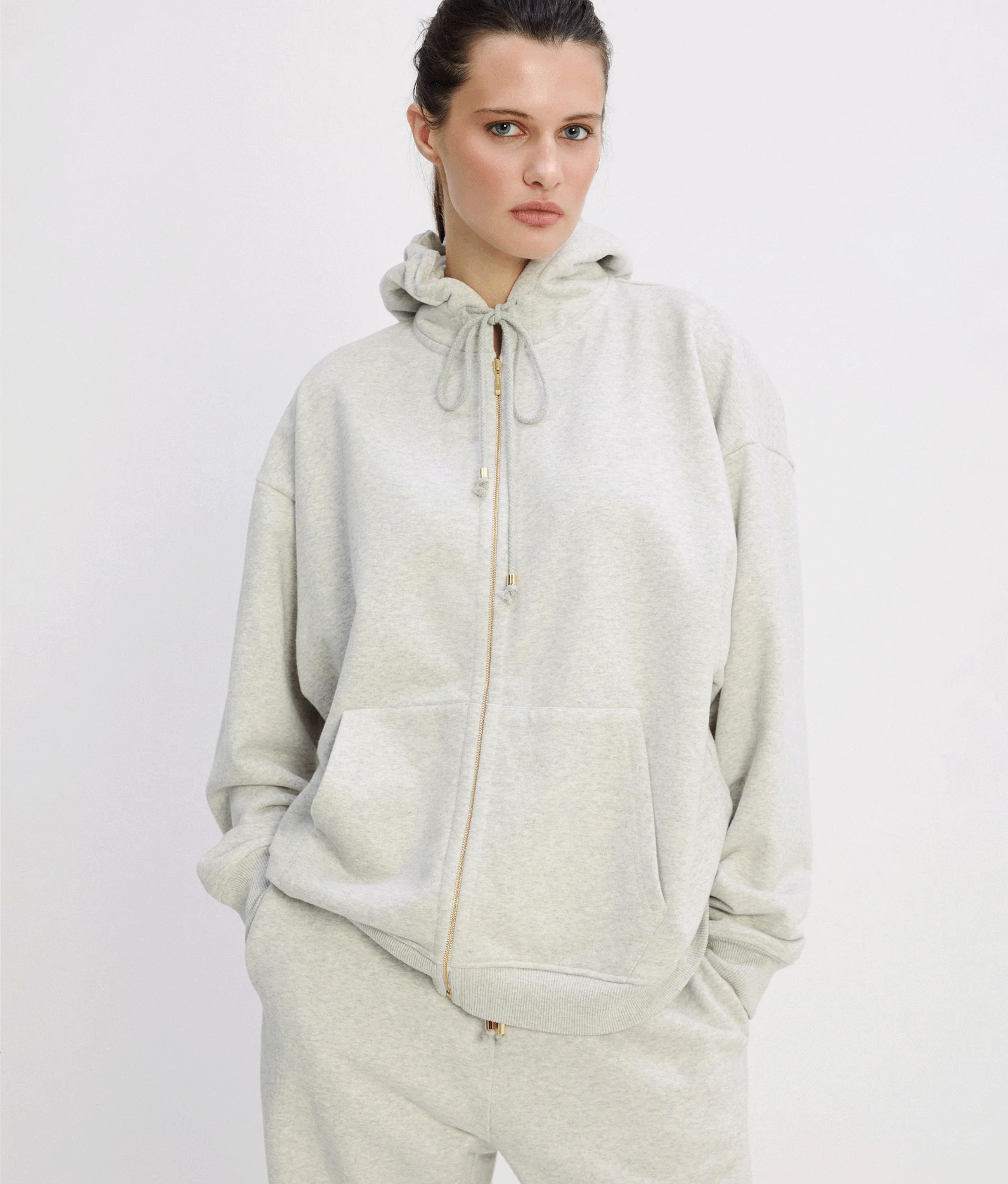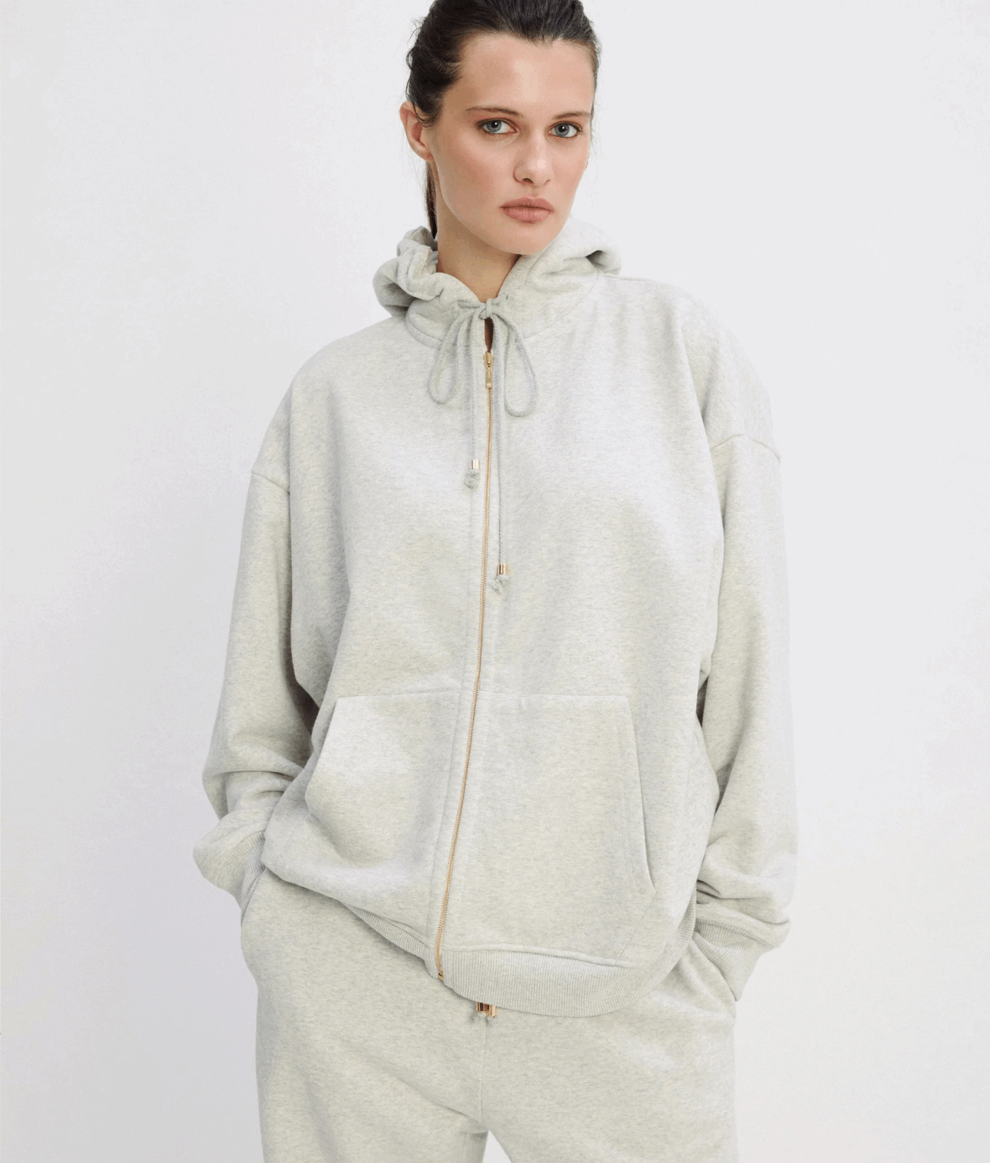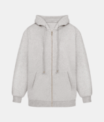 Худі на блискавці в кольорі сірий меланж. Дві кишені спереду, еластичні манжети та нижня гумка, куліса в капешоні.