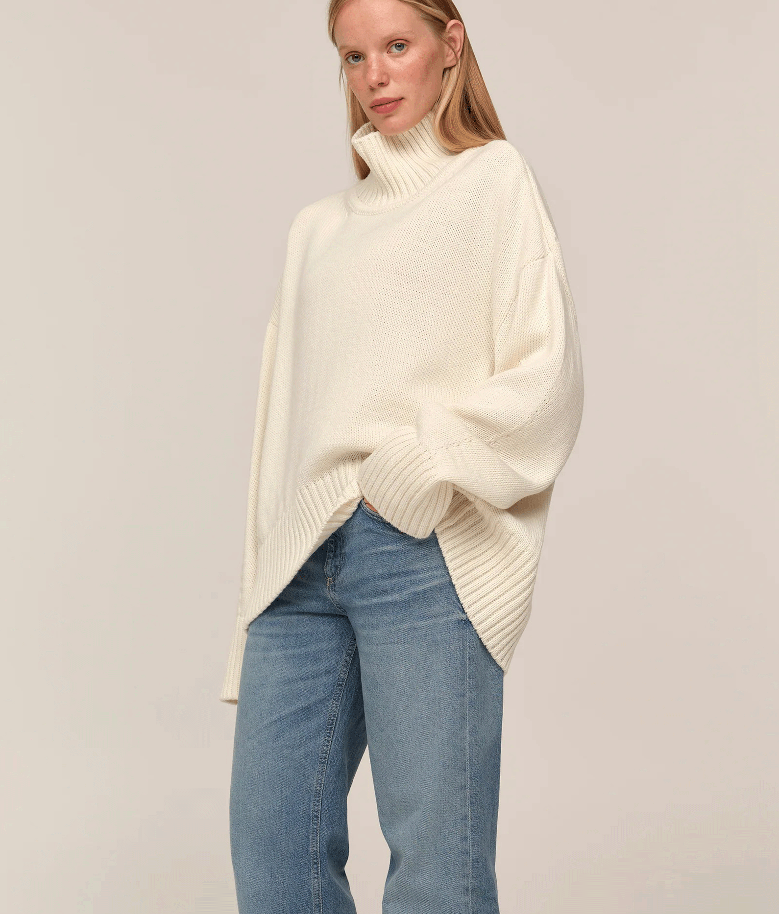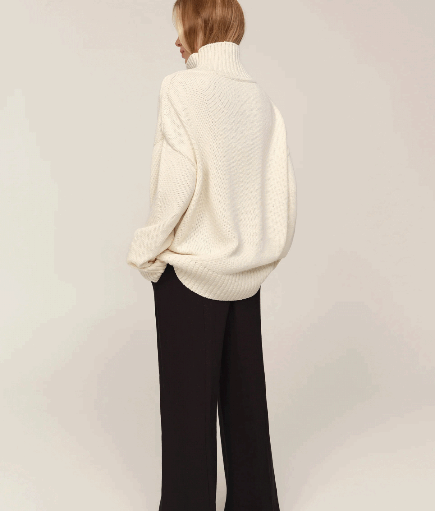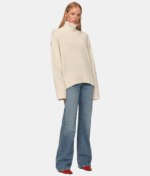 Цей светр із високою горловиною створений як сучасна класика, що поєднує комфорт і виразність форми. Його силует має відчутний об’єм, а різниця довжини між передом і спинкою додає конструктивної особливості та легкості. Подовжені рукава створюють відчуття затишку, а м’яка фактура підкреслює невимушеність образу. Це річ, що працює як основа гардеробу: природна у щоденних поєднаннях і виразна у більш продуманих стилізаціях.