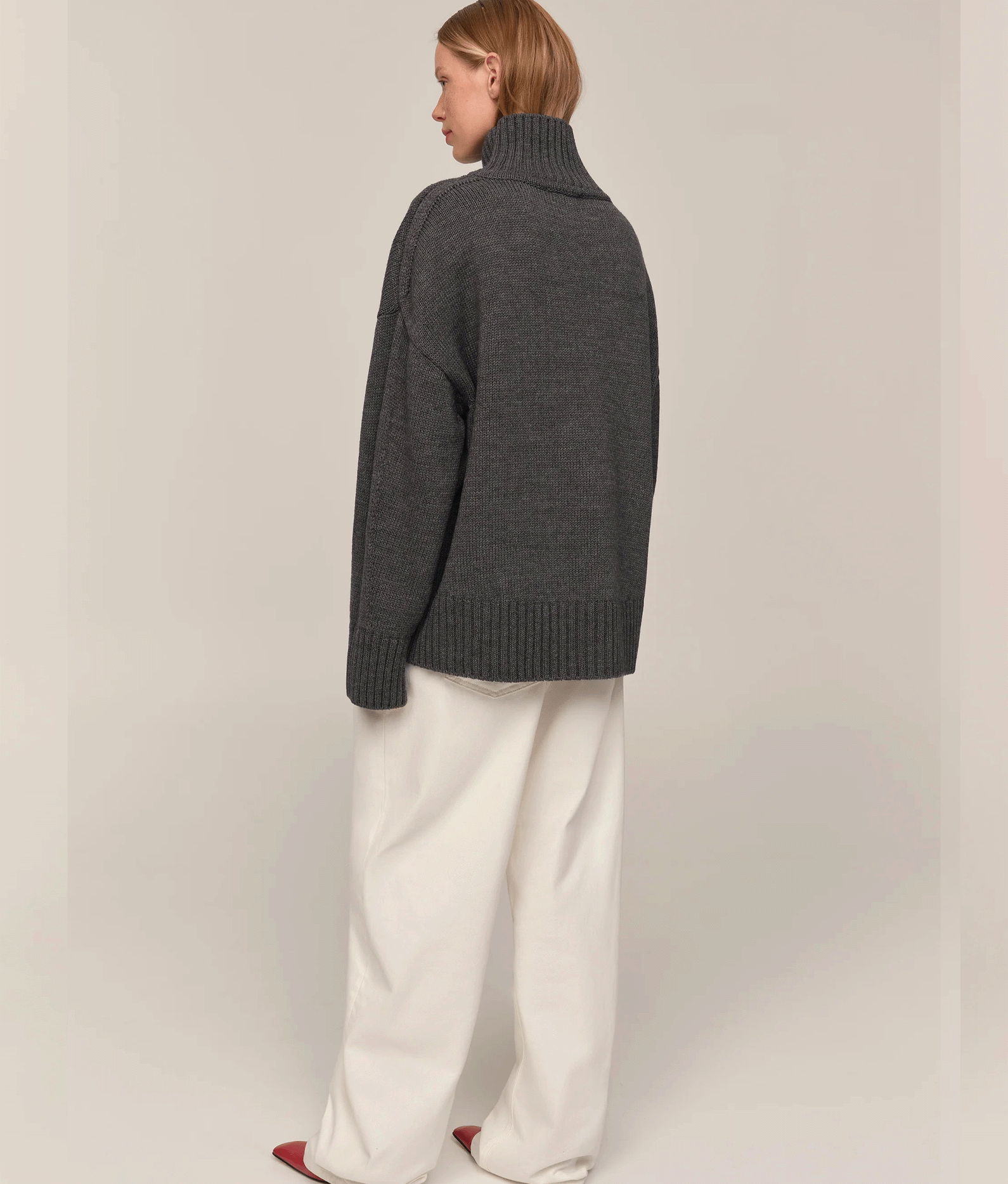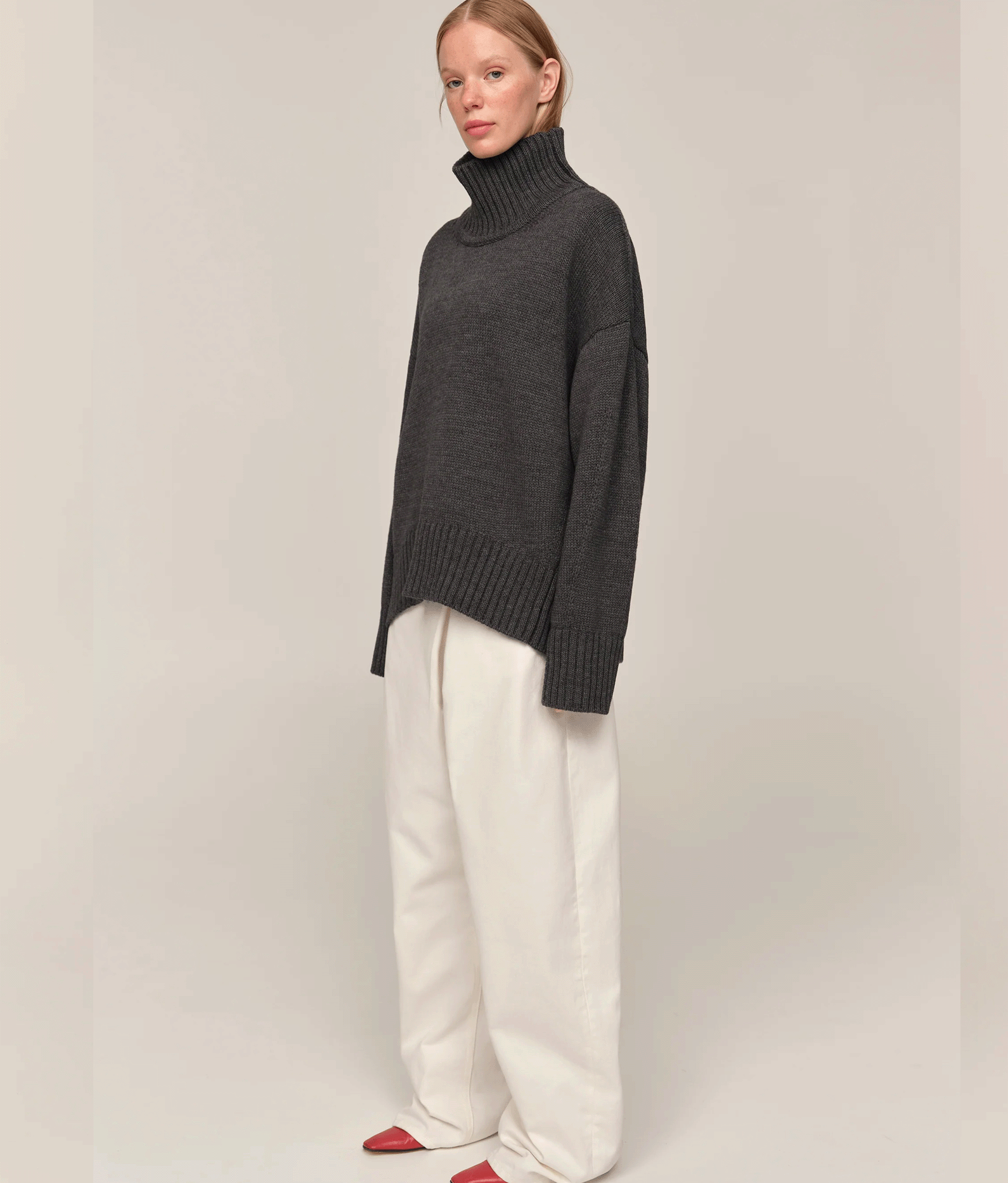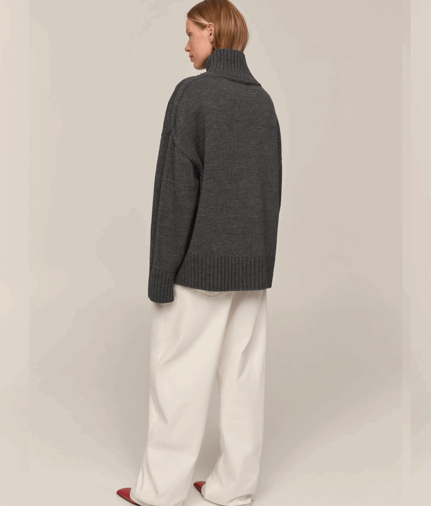 Цей светр із високою горловиною створений як сучасна класика, що поєднує комфорт і виразність форми. Його силует має відчутний об’єм, а різниця довжини між передом і спинкою додає конструктивної особливості та легкості. Подовжені рукава створюють відчуття затишку, а м’яка фактура підкреслює невимушеність образу. Це річ, що працює як основа гардеробу: природна у щоденних поєднаннях і виразна у більш продуманих стилізаціях.