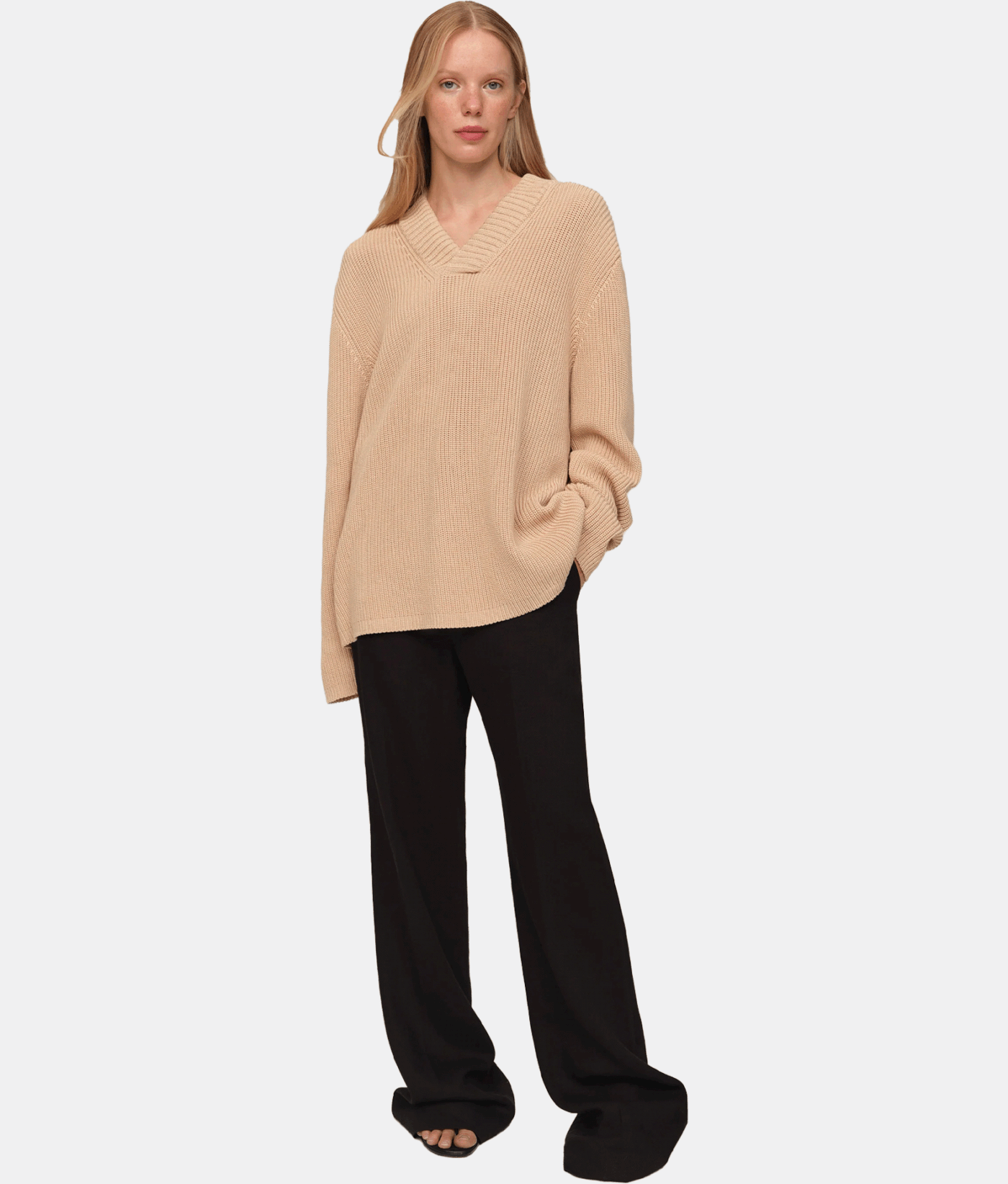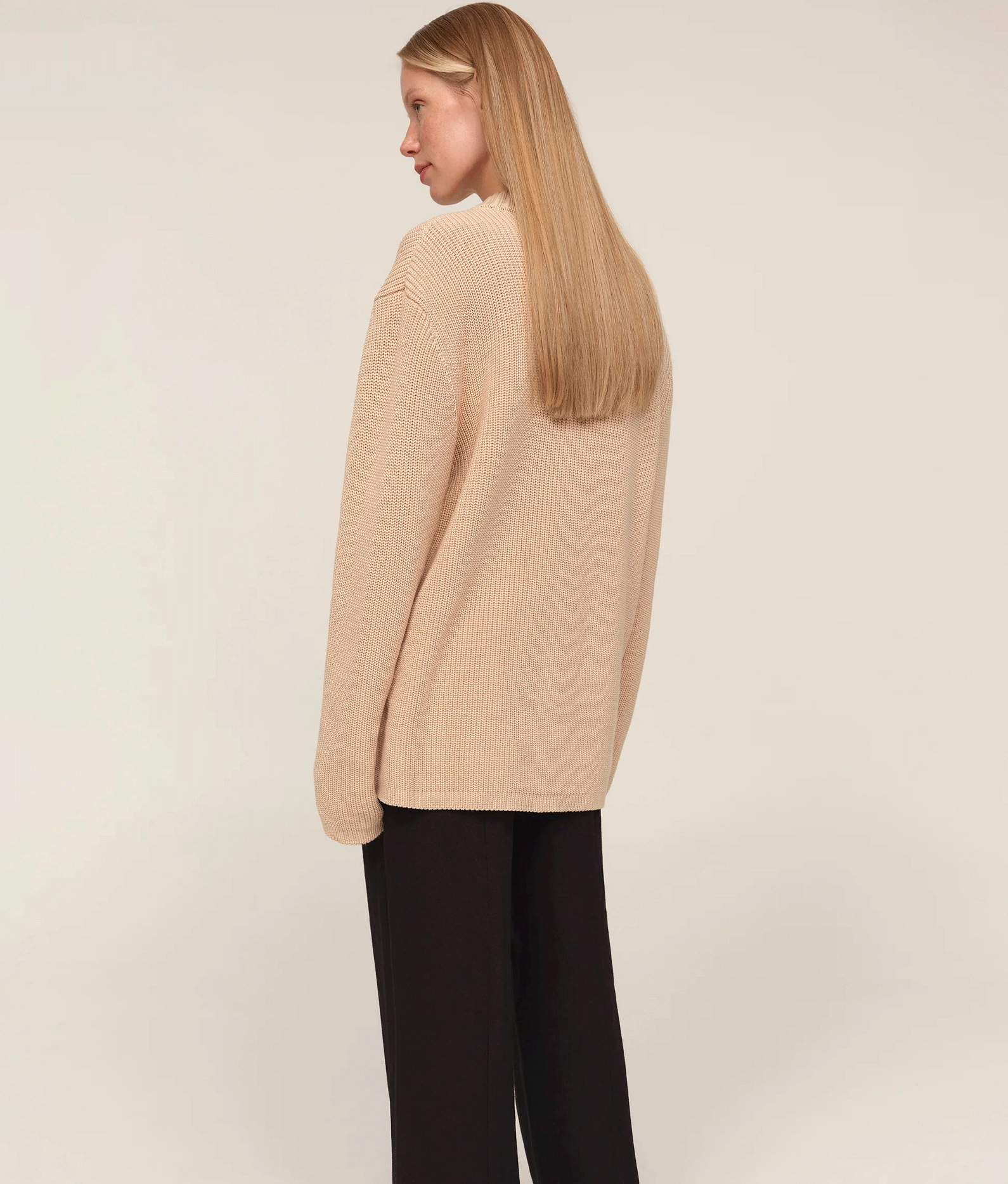 Створюючи цей бавовняний светр, ми свідомо працювали з пропорціями: подовжили виріб, щоб силует мав більш виразну і впевнену лінію, а глибину вирізу витримали стримано — для балансу. Комір обрамлює шию з легкою чіткістю, додаючи образу зосередженості.