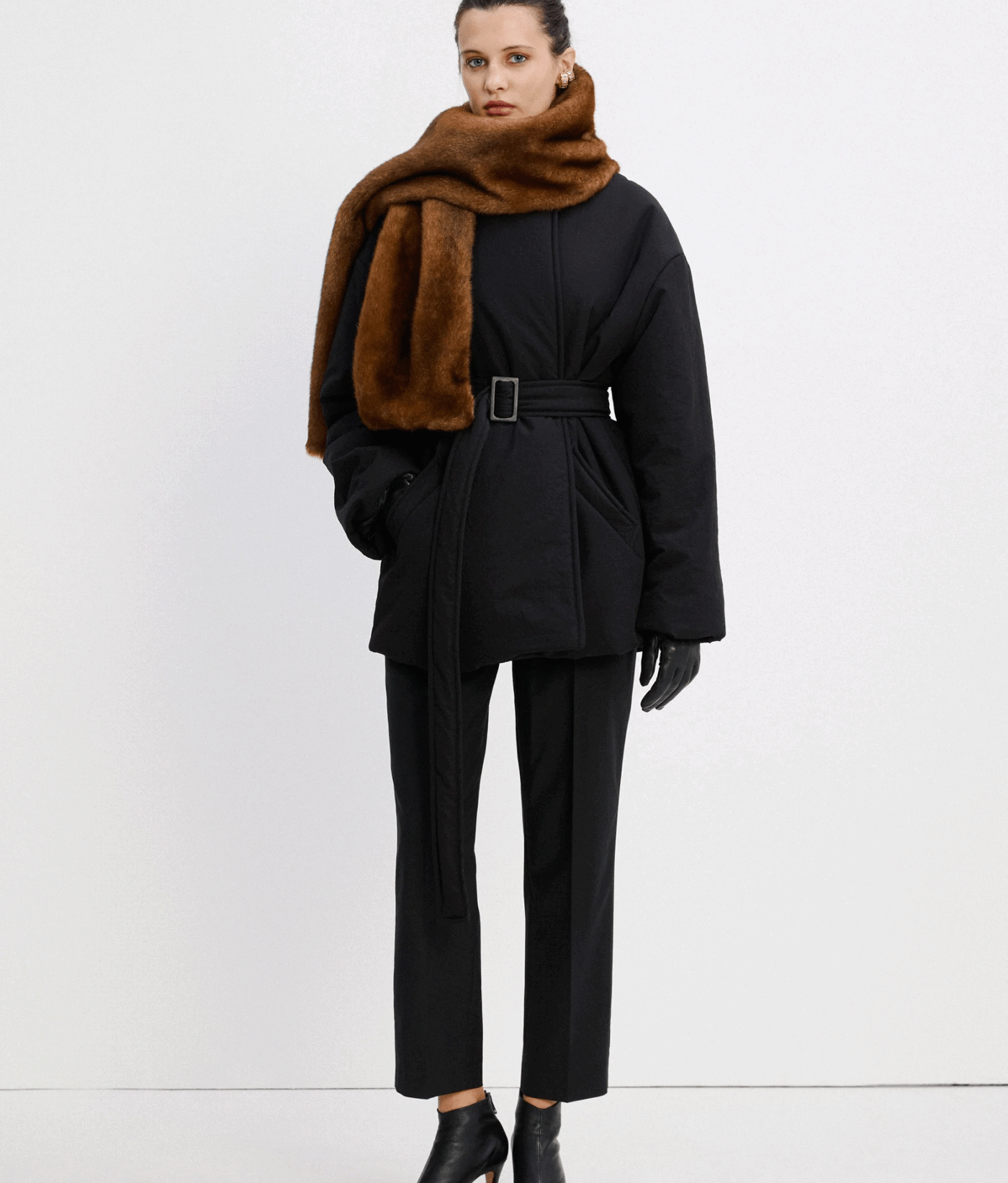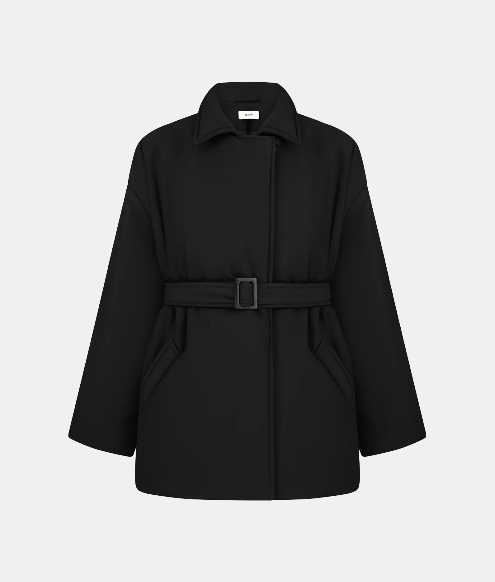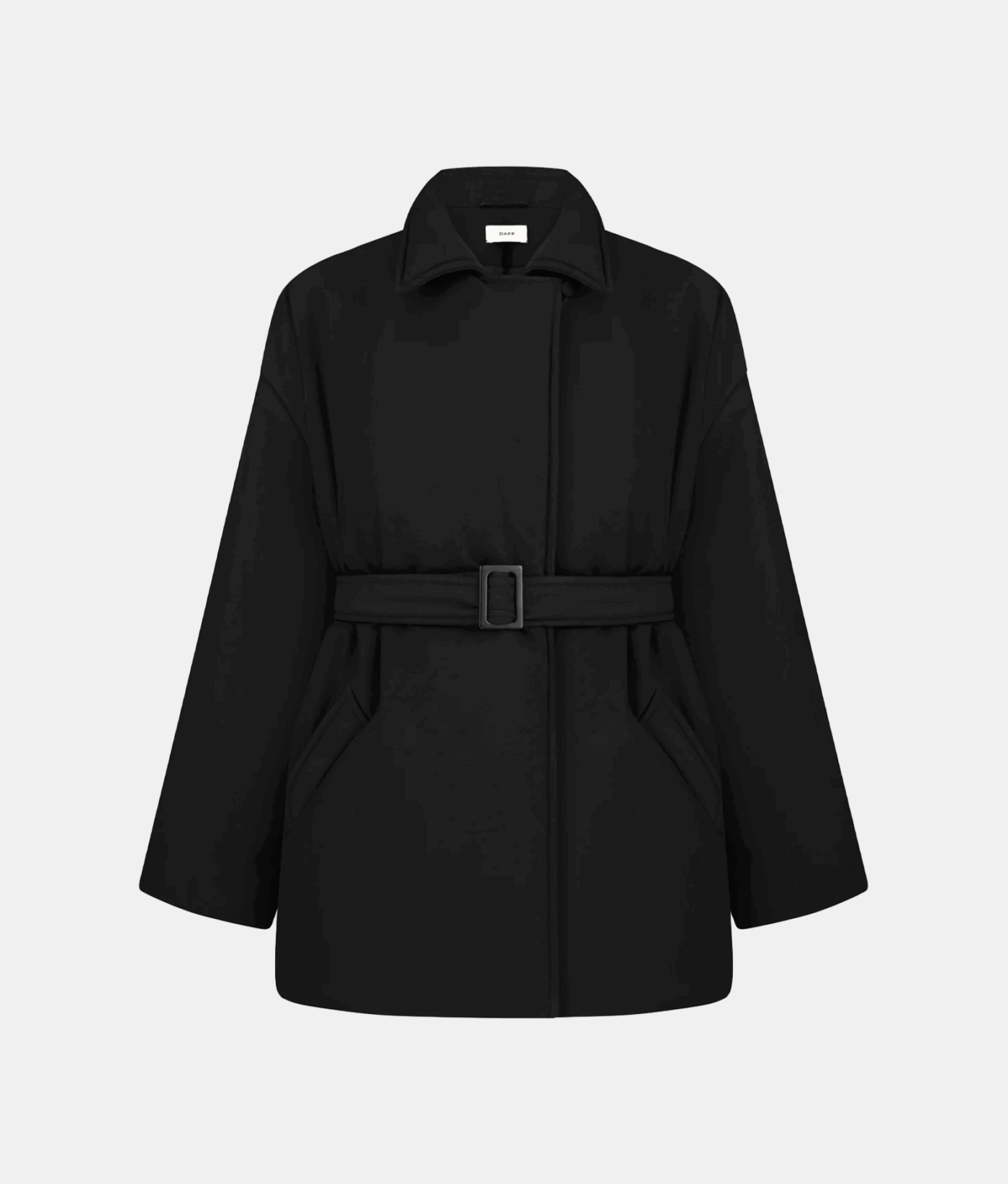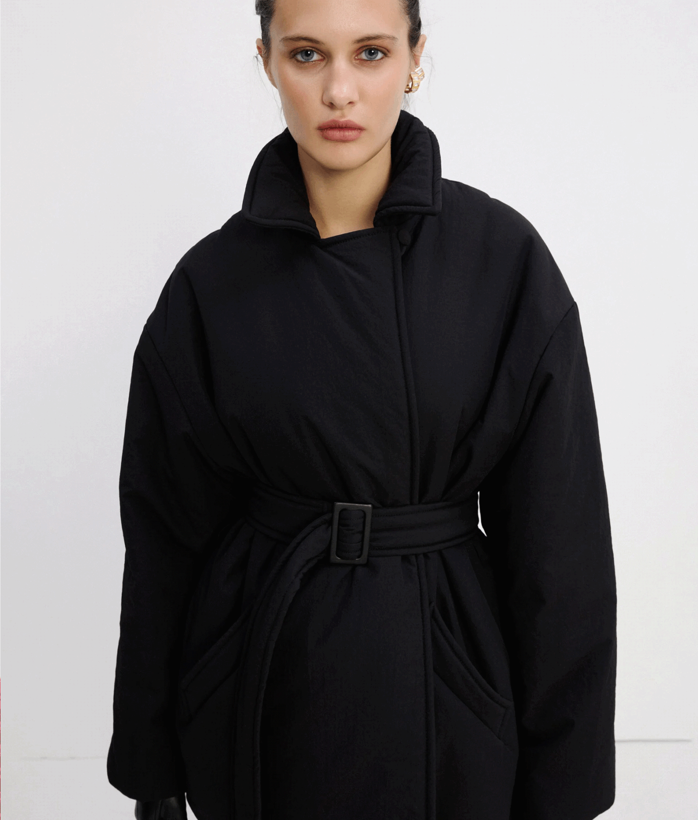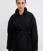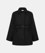 Однобортна куртка прямого крою. Дві передні прорізні кишені. Внутрішня прихована застібка та один обтягнутий ґудзик зверху. У комплекті — пояс з контрастною пряжкою.